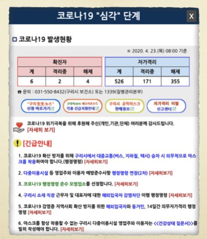 구리시청 홈페이지에 들어가면 위와 같은 코로나 19와 관련된 현재 구리시 상황에 대해서 가장 보기 좋게 팝업으로 되어 있습니다.