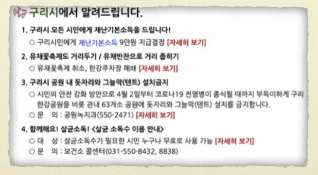 구리시청 홈페이지에 들어가면 코로나 19와 관련된 정보가 가장 맨 위에 올라와 있습니다. 그 이유는 모든 지자체가 코로나 19 방역에 힘쓰고 있고 가장 우선적인 정책이기 때문이라고 생각합니다.