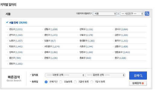 위의 링크를 통해서 접속을 하면 지역의 벼룩시장에서 모아진 구인구직 정보를 한번에 검색이 가능합니다. 그 일자리 정보는 결코 무시할 수 없는 수준이라고 보여집니다. 모든 지역 생활지의 정보를 모아놓았으니 당연한것 같습니다.