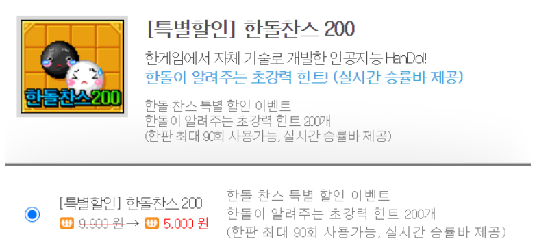 하지만 이 한돌 바둑은 무료가 아닙니다. Handol 찬스 같은 아이템이 있어서 돈을 주고 구매를 해야합니다. 한판 최대 90회 이용이 가능하고 실시간 승률바를 제공을 하는 기능이지요.